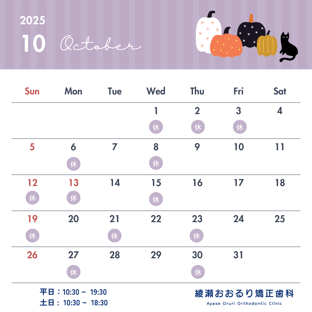 こんにちは、綾瀬おおるり矯正歯科です🦷✨。少し遅くなりましたが、皆様のために10月の診療カレンダーをご案内いたします📅。ご自身の予定に合わせたご予約をぜひお待ちしております。