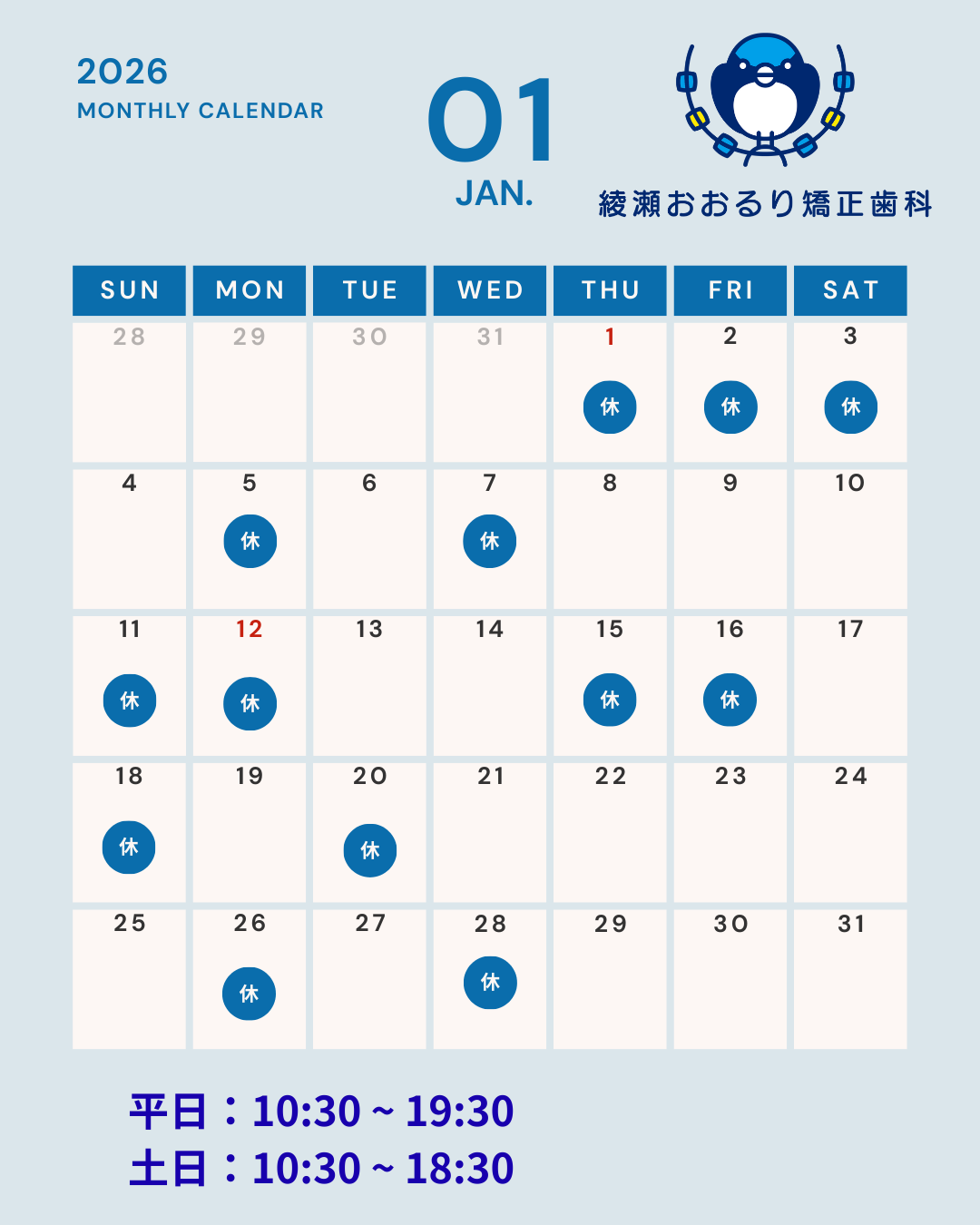 1月の診療カレンダーが完成しました!✨新年を迎え、矯正治療を計画されている皆さまにとって、より良いスタートを切るためにお役立ていただければ幸いです🦷治療は計画的に、スケジュールをチェックしながらしっかり管理していきましょう📅.ご来院の際は、必ずカレンダーをご確認ください。新しい年は美しい笑顔で始めましょう😊✨私たちのクリニックは、皆さまの安心・安全な治療のために最善を尽くして参りますので、何かご不明な点やご質問がございましたらお気軽にご連絡ください💌