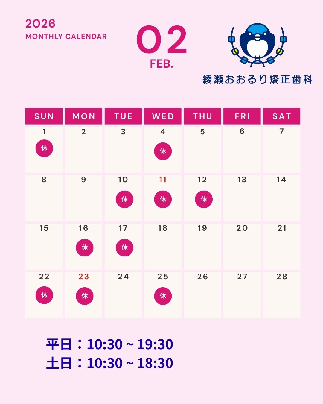✨2月の診療カレンダーが更新されました✨ 皆さま、こんにちは!2月のカレンダーをご確認ください😊 平日は通常の診療時間を設定しておりますが、土日は時間が異なることがありますのでご注意ください📆 また、私たちは全ての曜日で診療を行っておりますが、休診日は不定期となっております🔍 そのため、来院前にはカレンダーで最新の情報をぜひチェックしてください🗓️